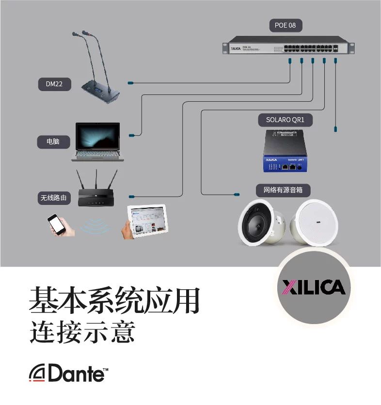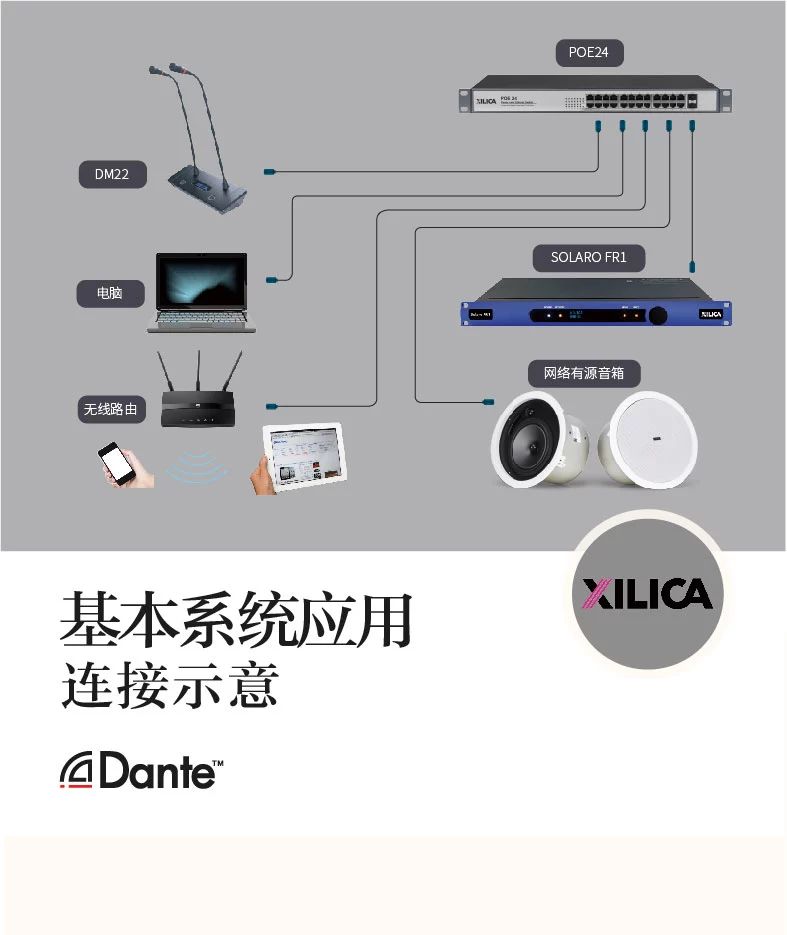 Dante數字音頻傳輸美女福利导航,是一種專業、無壓縮的、基於3層的IP網絡的新一代網絡音頻傳輸美女福利导航。它和傳統的音頻傳輸有著很大的區別,它僅使用一條網線就可以傳輸數字音頻、供電和控製同時進行,省去了極大的建設成本,減少了不必要的人力和財力。