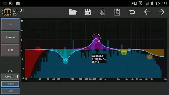 MR18內置高端的100段頻帶的實時頻譜分析儀,所有輸入輸出通道的EQ頁麵具備完整的條形圖和光譜RTA顯示。另外RTA也可顯示於GEQ頁麵,擁有MR18後對信號的監視和控製從此變得更容易!