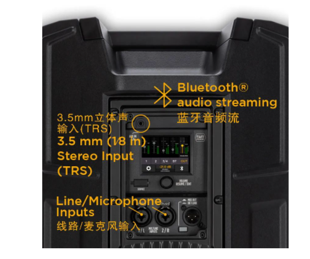 內置調音台最多可以連接兩個線源或麥克風,帶有單獨的48V幻像電源和一個非平衡的立體聲源。它還可以管理來自Bluetooth®音頻流的無線立體聲信號。