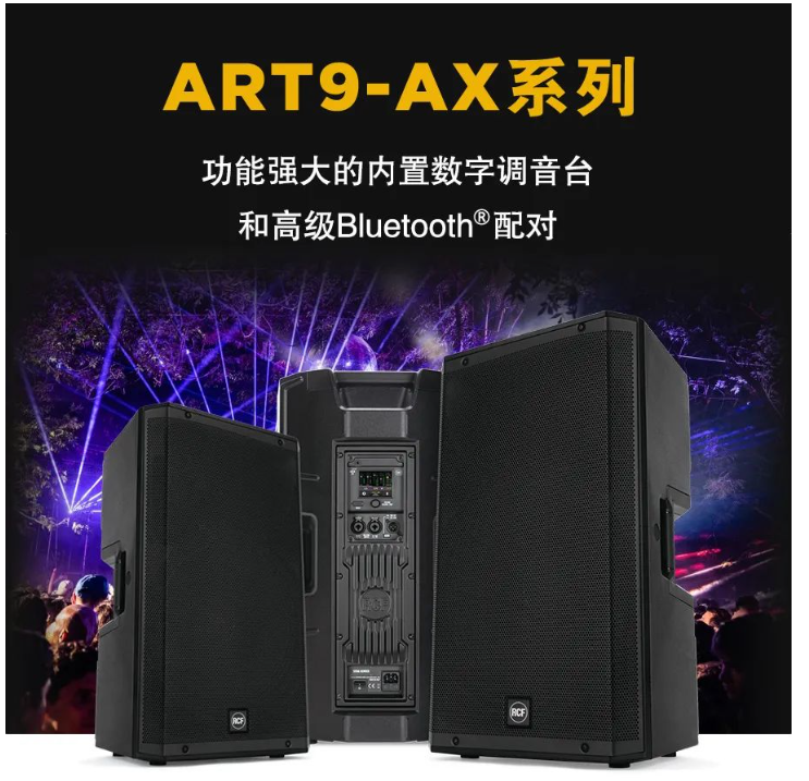 RCF最新推出了全新的ART9-AX係列,ART9-AX是一款具有48V麥克風前置放大器和線路輸入、內置6通道數字調音台和高級DSP、Bluetooth®(藍牙)流媒體和控製功能的兩分頻揚聲器。適用於任何音頻應用的頂級解決方案。
